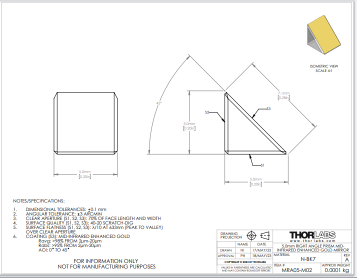 Thorlabs索雷博 MRA05-M02 直角棱镜反射镜