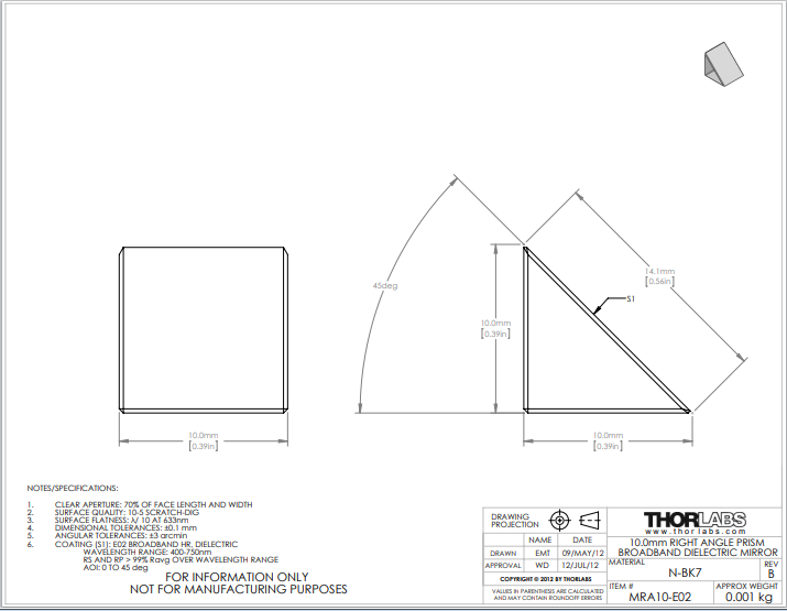 Thorlabs索雷博       MRA10-E02   直角棱镜反射镜