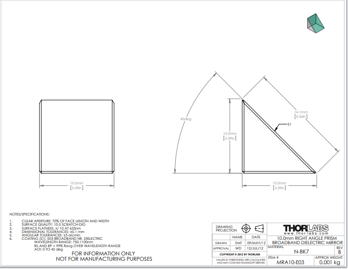 Thorlabs索雷博       MRA10-E03   直角棱镜反射镜