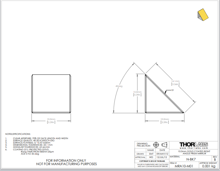 Thorlabs索雷博       MRA10-M01   直角棱镜反射镜