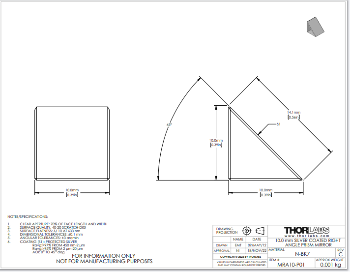 Thorlabs索雷博 MRA10-P01 直角棱镜反射镜