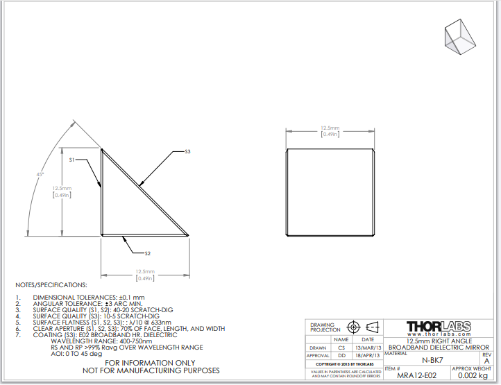 Thorlabs索雷博 MRA12-E02 直角棱镜反射镜