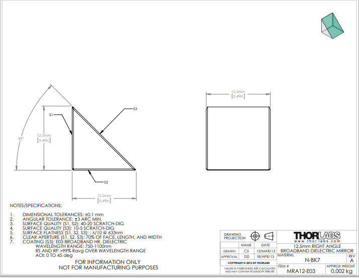 Thorlabs索雷博       MRA12-E03   直角棱镜反射镜