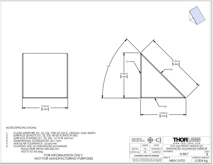 Thorlabs索雷博 MRA15-F01 直角棱镜反射镜