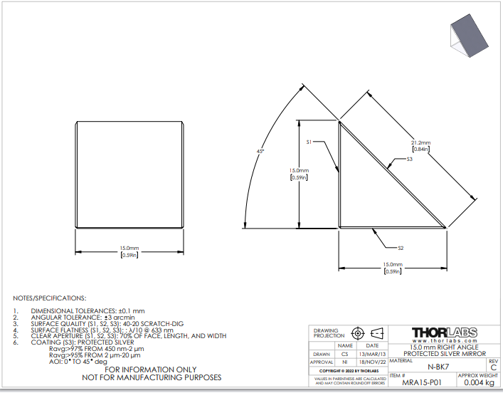 Thorlabs索雷博       MRA15-P01   直角棱镜反射镜