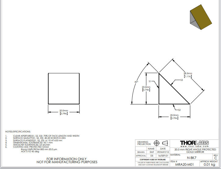 Thorlabs索雷博 MRA20-M01 直角棱镜反射镜