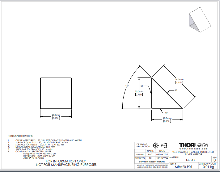 Thorlabs索雷博 MRA20-P01 直角棱镜反射镜