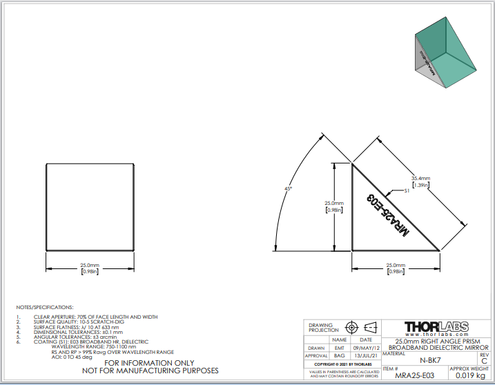 Thorlabs索雷博 MRA25-E03 直角棱镜反射镜