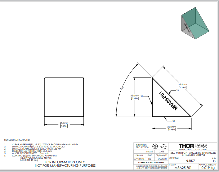 Thorlabs索雷博 MRA25-F01 直角棱镜反射镜