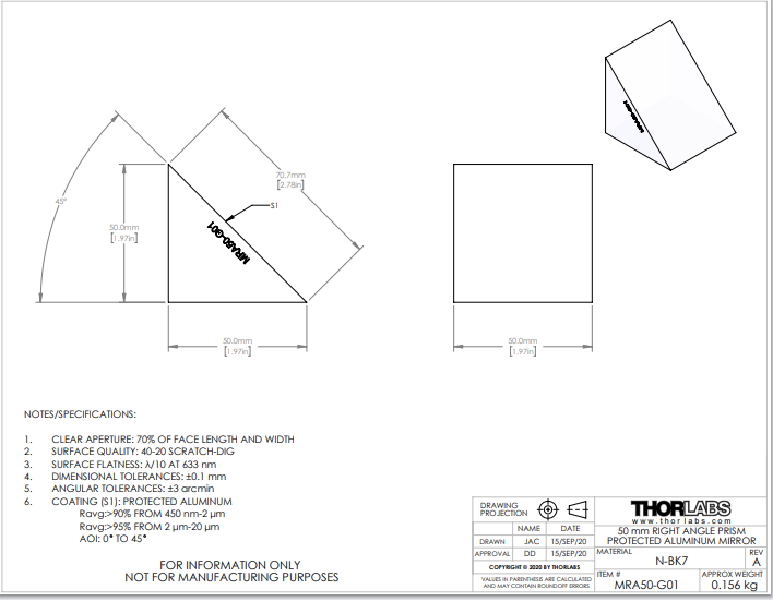 Thorlabs索雷博 MRA50-G01 直角棱镜反射镜