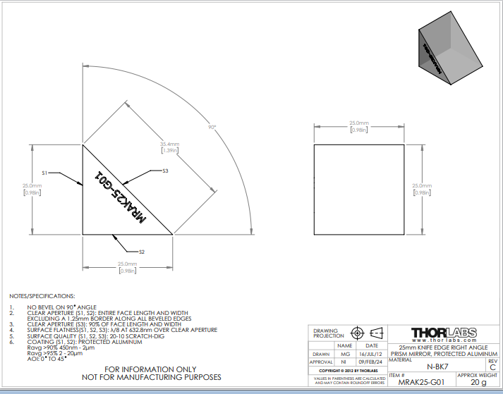 Thorlabs索雷博 MRAK25-G01 刀锋直角棱镜反射镜