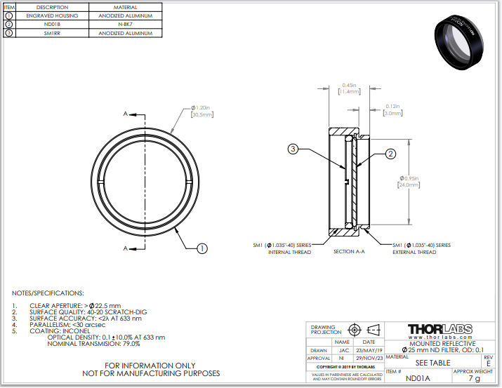 Thorlabs索雷博 ND01A Ø25 mm反射型中性密度滤光片