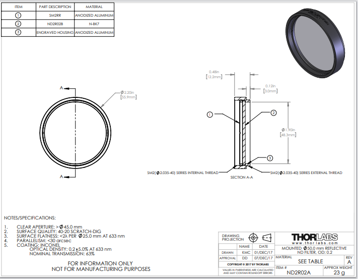 Thorlabs索雷博 ND2R02A Ø50 mm反射型中性密度滤光片