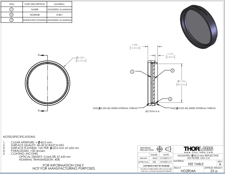Thorlabs索雷博       ND2R04A   Ø50 mm反射型中性密度滤光片