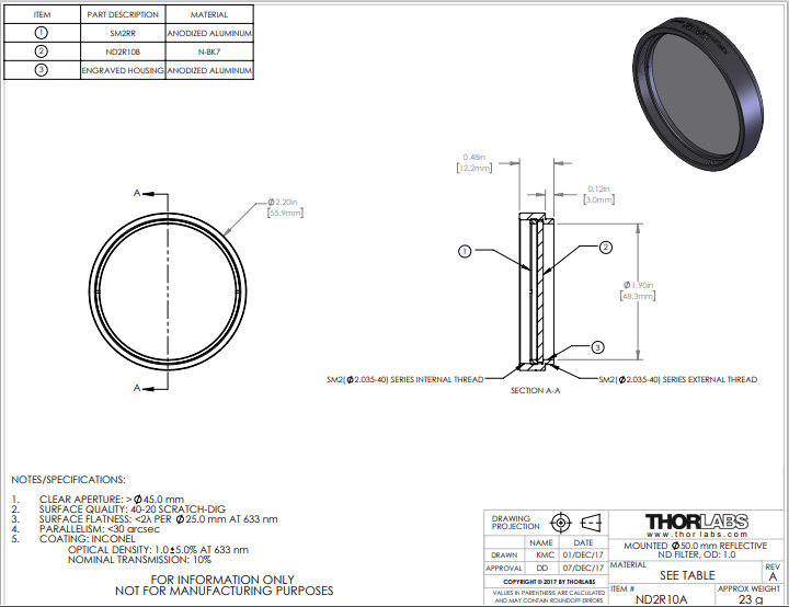 Thorlabs索雷博       ND2R10A   Ø50 mm反射型中性密度滤光片