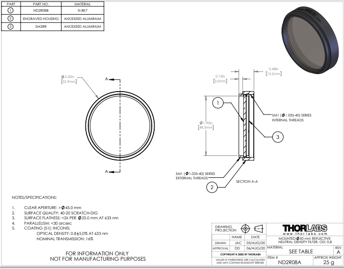 Thorlabs索雷博 ND2R08A Ø50 mm反射型中性密度滤光片