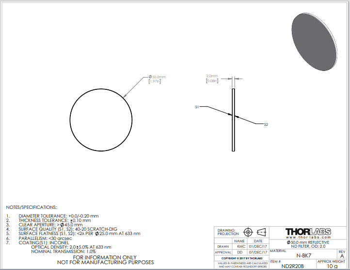 Thorlabs索雷博 ND2R20B 反射型中性密度滤光片