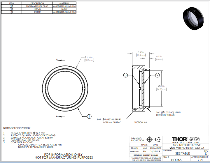 Thorlabs索雷博 ND04A Ø25 mm反射型中性密度滤光片