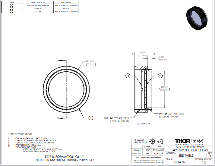 Thorlabs索雷博 ND40A Ø25 mm反射型中性密度滤光片