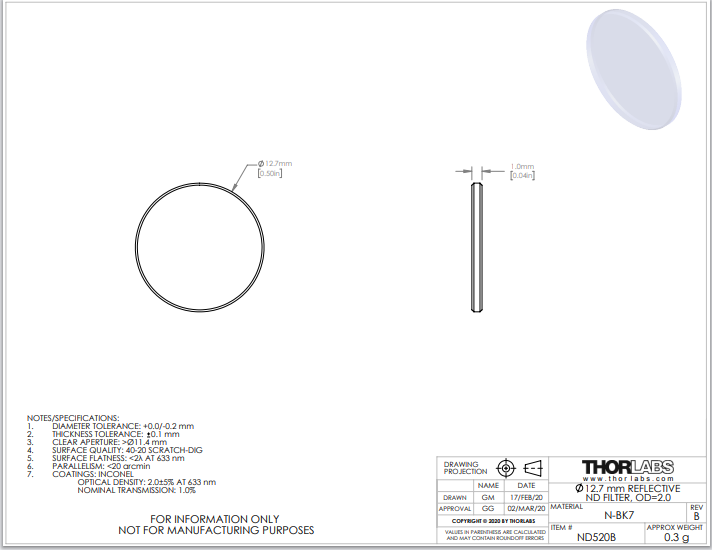 Thorlabs索雷博       ND520B   反射型ND滤光片