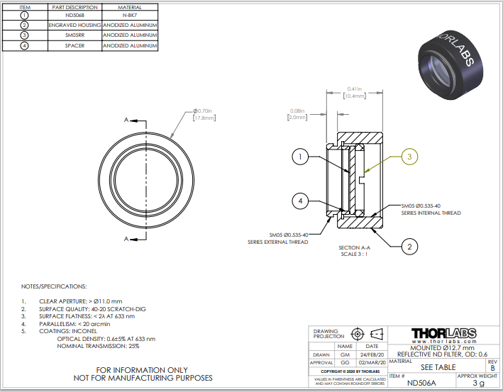 Thorlabs索雷博 ND506A Ø1/2英寸反射型中性密度滤光片