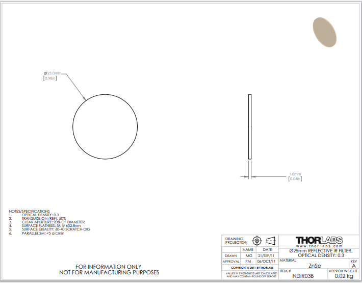 Thorlabs索雷博       NDIR03B   Ø25毫米未安装的红外反射型中性密度滤光片