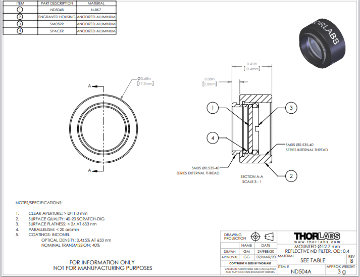 Thorlabs索雷博       ND504A   Ø1/2英寸反射型中性密度滤光片