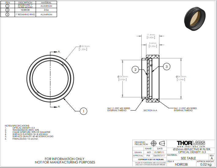 Thorlabs索雷博 NDIR03A Ø25毫米,SM1螺纹安装座,红外反射型中性密度滤光片