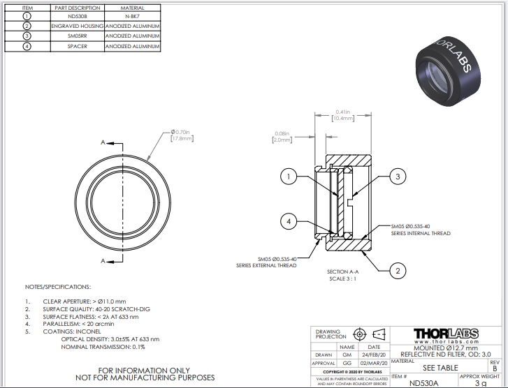 Thorlabs索雷博       ND530A   Ø1/2英寸反射型中性密度滤光片