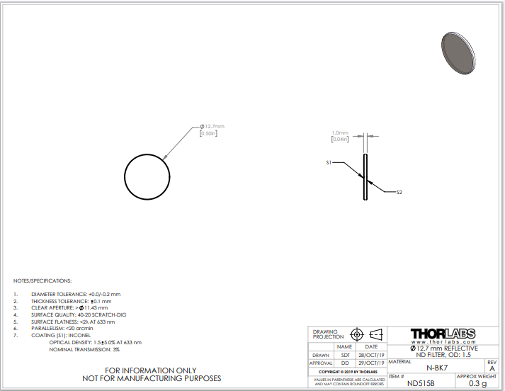 Thorlabs索雷博 ND515B 反射型ND滤光片