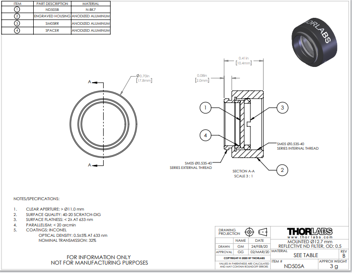Thorlabs索雷博       ND505A   Ø1/2英寸反射型中性密度滤光片