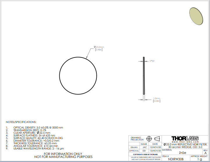 Thorlabs索雷博 NDIRW30B 楔形反射型ND滤光片