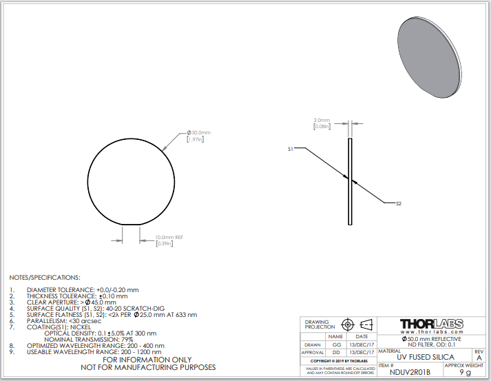 Thorlabs索雷博 NDUV2R01B 中性密度滤光片