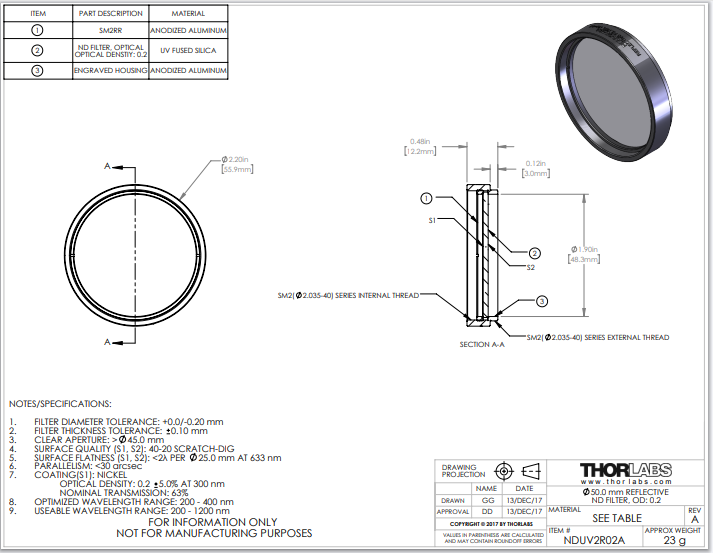 Thorlabs索雷博       NDUV2R02A   反射型中性密度滤光片