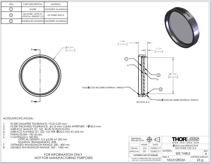 Thorlabs索雷博 NDUV2R03A 反射型中性密度滤光片
