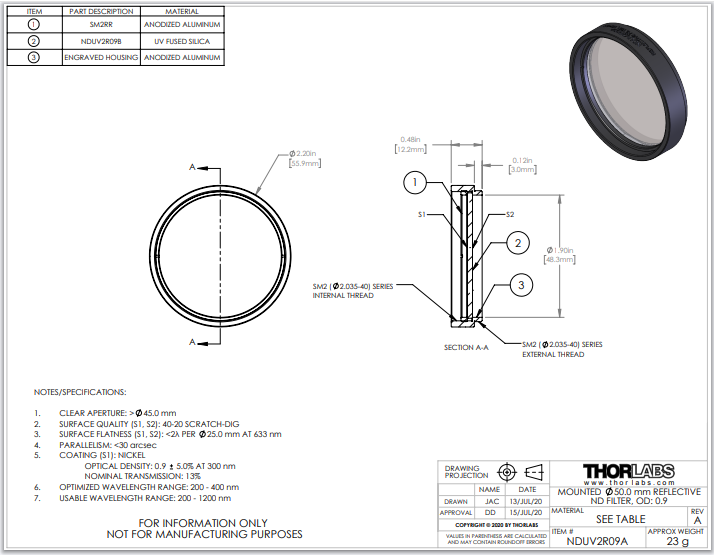 Thorlabs索雷博       NDUV2R09A   反射型中性密度滤光片