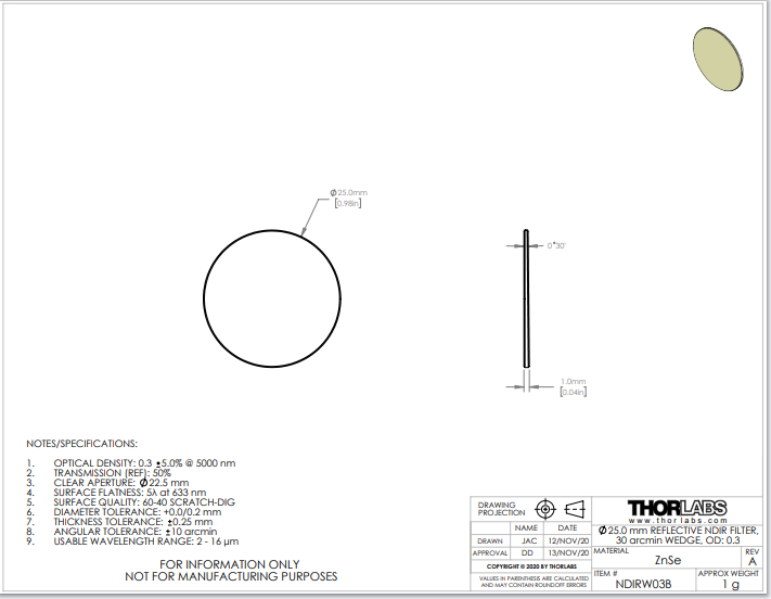 Thorlabs索雷博 NDIRW03B 楔形反射型ND滤光片