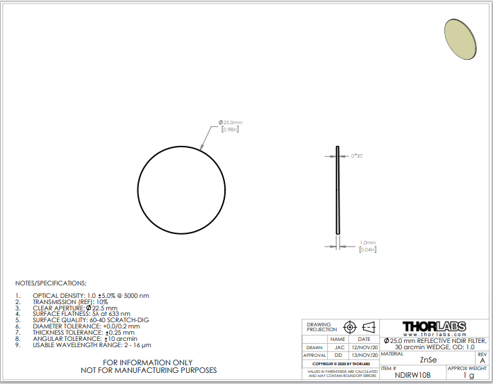 Thorlabs索雷博 NDIRW10B 楔形反射型ND滤光片