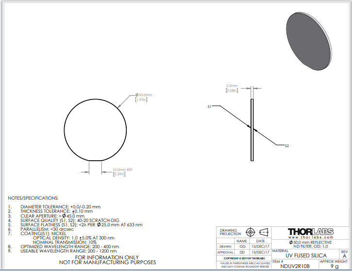 Thorlabs索雷博 NDUV2R10B 中性密度滤光片