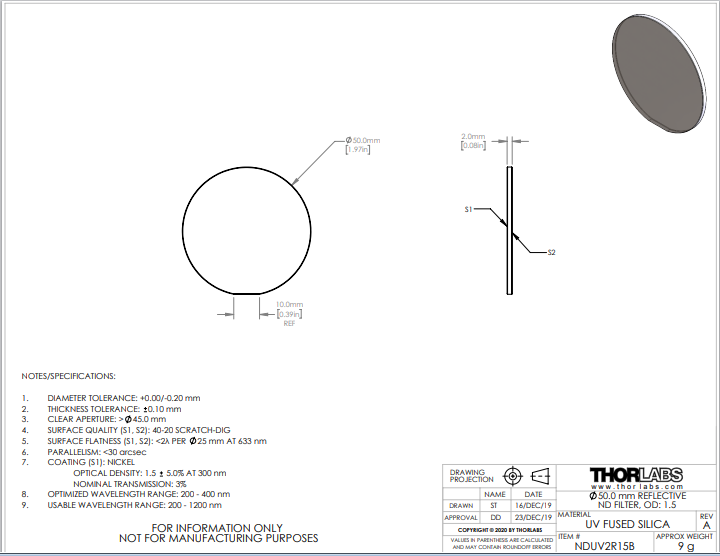 Thorlabs索雷博 NDUV2R15B 中性密度滤光片