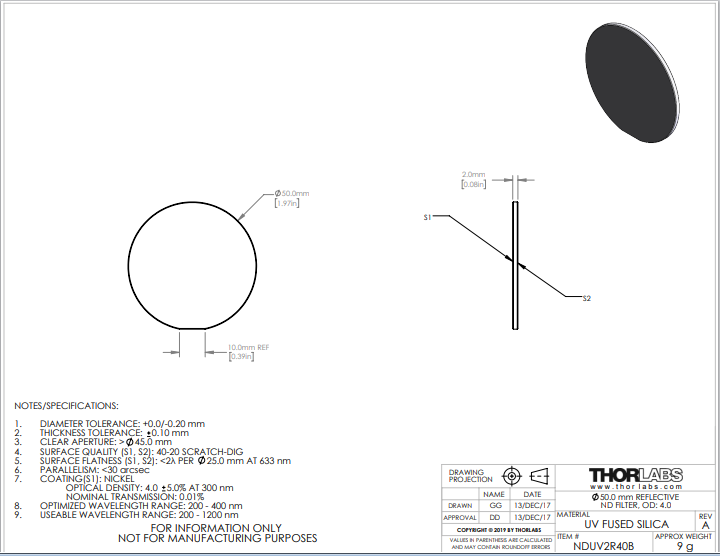 Thorlabs索雷博 NDUV2R40B 中性密度滤光片