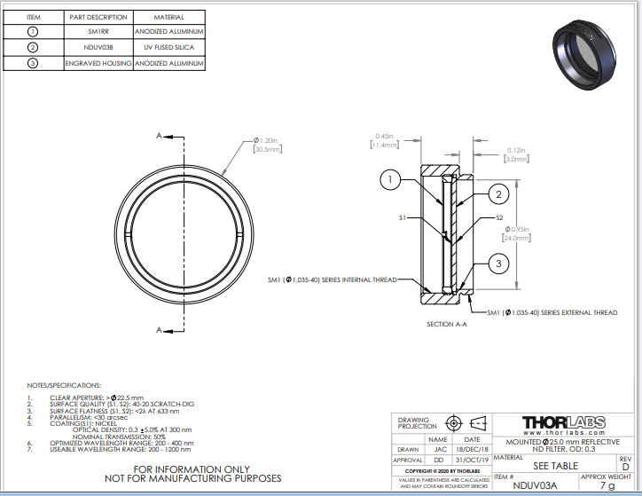 Thorlabs索雷博 NDUV03A 反射型中性密度滤光片