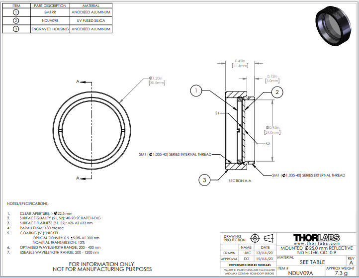 Thorlabs索雷博 NDUV09A 反射型中性密度滤光片