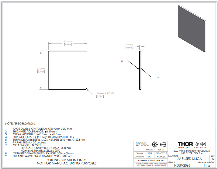 Thorlabs索雷博 NDUV206B 中性密度滤光片