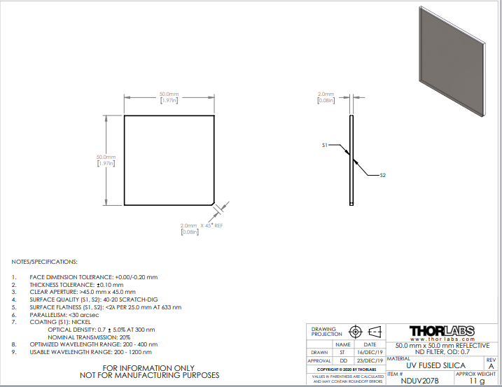 Thorlabs索雷博 NDUV207B 中性密度滤光片