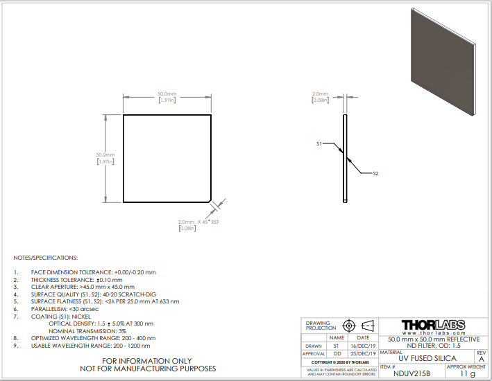 Thorlabs索雷博 NDUV215B 中性密度滤光片