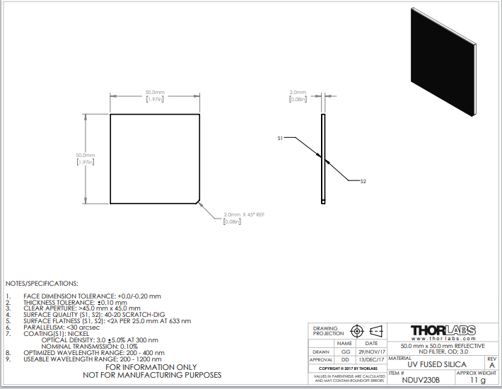 Thorlabs索雷博 NDUV230B 中性密度滤光片