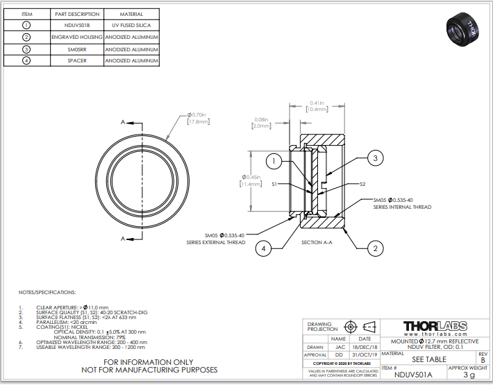 Thorlabs索雷博       NDUV501A   反射型中性密度滤光片