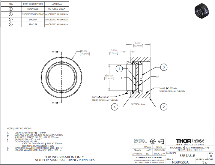 Thorlabs索雷博       NDUV503A   反射型中性密度滤光片
