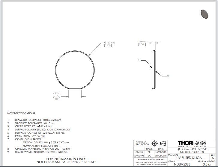 Thorlabs索雷博 NDUV508B 中性密度滤光片